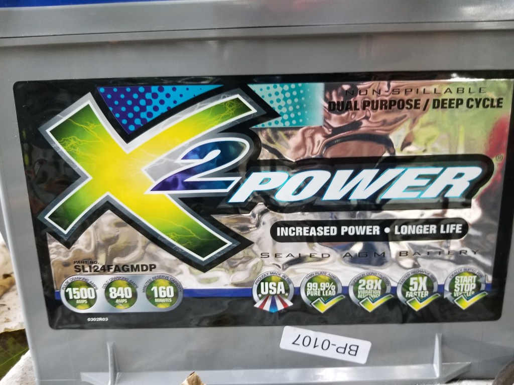 I did a lot of research on various forums and landed on the X2 Power battery due to the overall reviews and performance compared to other brands. This battery is a 76ah battery, fits in the factory tray, is shock resistant (AGM), and is a dual purpose battery (meaning starting and deep cycle). This battery was purchased new from my local Battery Plus, I did this so that I could get a replacement if ever needed. These come with a 5 year warranty.