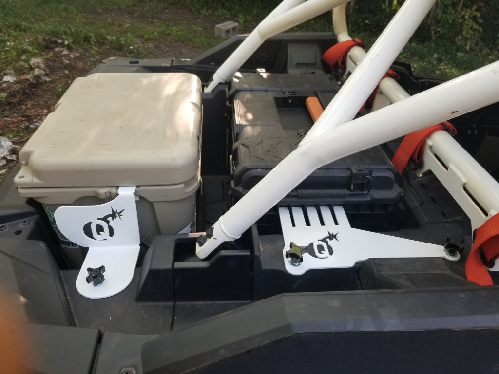 We tend to stay out on the trails for extended amounts of time in the hot southeastern heat and humidity so we knew we wanted to carry our Yeti 20qt cooler with us. We also wanted to carry our recovery kit, various tools and spare parts just in case. While looking for parts I found Big Hammer Fab (BHF) Yeti cooler and Rigid tool box mounts. These are solid steel and mounted using their provided hardware. BHF did a custom design for me and I painted them white to match the color scheme. These are rock solid mounts that stay put, even in the event of a roll over. We highly recommend them to anyone hitting the trails with a cooler and/or tool box. BHF also makes many other parts and accessories for all makes and models.