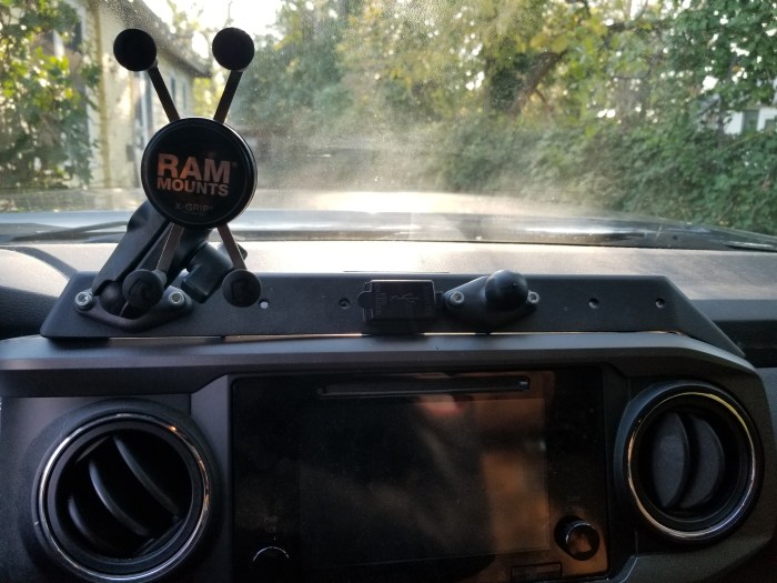 This mod has become one of my most used on the Tacoma since Georgia passed the hands free law. I added this to the Tacoma to have a nice place to mount my phone and tablet when offroading. This is a very sturdy mount that accepts ram mounts products to easily mount anything you need … Continue reading ExE Toyota Powered Accessory Mount (T.P.A.M.)